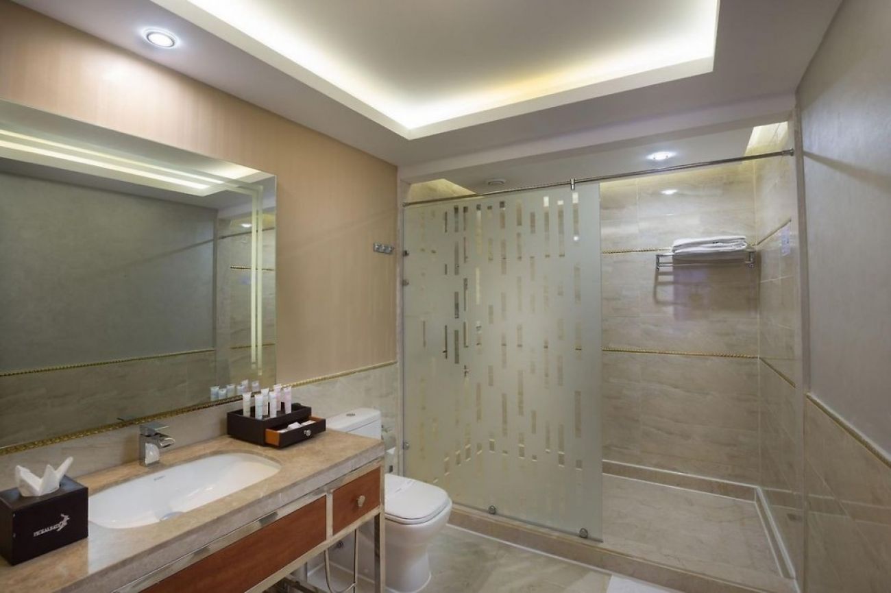 В стаите: Хотелът разполага с общо 226 стаи. Всички стаи са оборудвани с климатик, телевизор, телефон, баня с душ, сешоар, минибар (зарежда се всеки ден с минерална вода - безплатно), сейф (безплатно). Почистване на стаите и смяна на кърпите - всеки ден, смяна на спално бельо – 3 пъти в седмицата.