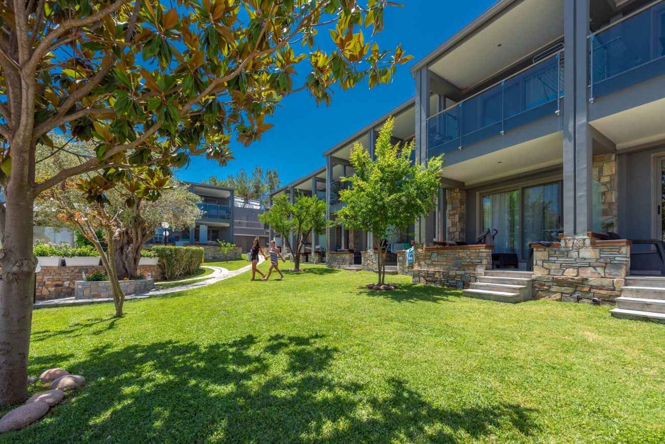 Хотелът се намира в селището Ханиоти , на 120м от плажа и само на 50м от центъра на селището