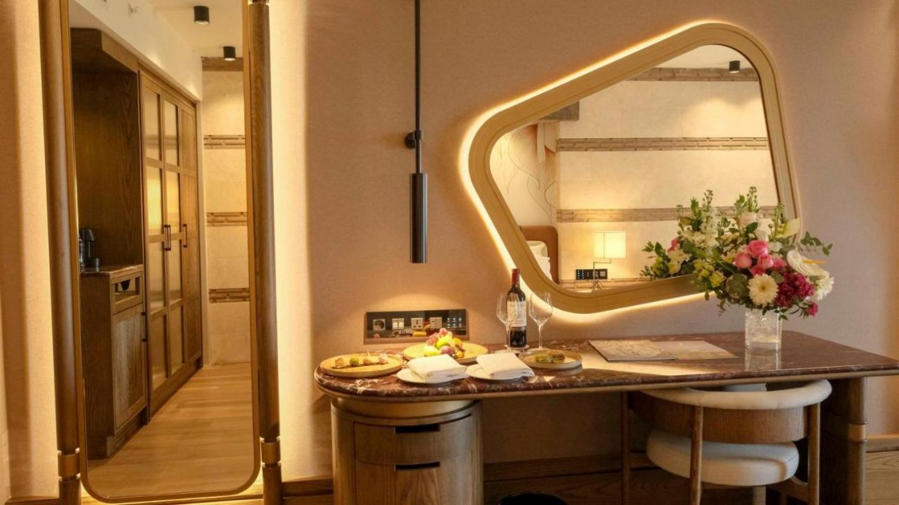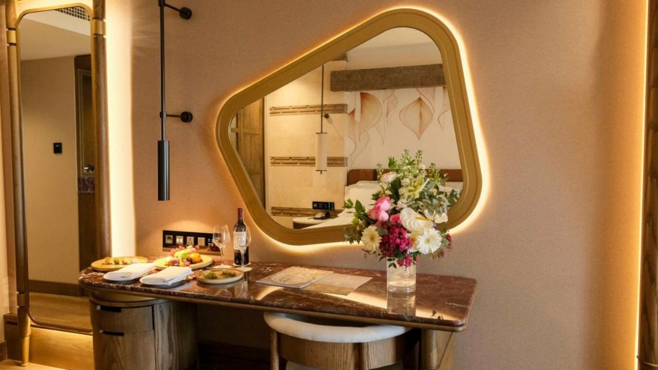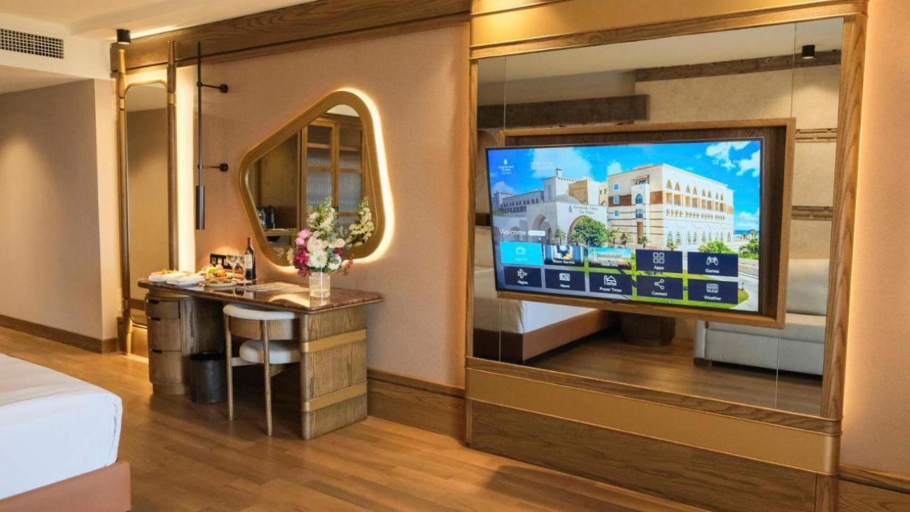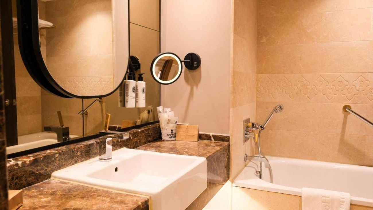 вана и душ,сешоар,везна,халат,чехли,централен климатик (Main building, регулира се от гостите на хотела),индивидуален климатик (villas,плазмен телевизор (може да се използва и като монитор за компютър – срещу допълнително заплащане),телефон,мини-бар (платено), сейф (в стаята, безплатно),под – паркет,балкон или тераса,почистване на стаите – ежедневно,смяна на спално бельо (по желание на гостите, ежедневно),room service (24 часа, платено),интернет (безжичен, кабелен, безплатно).
