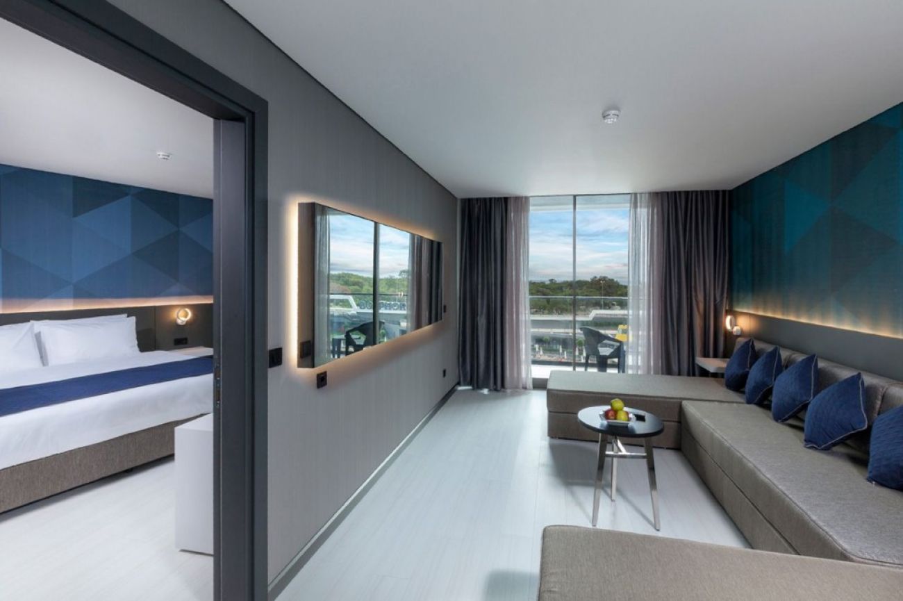 Стаи: Хотелът се състои от една основна 10-етажна сграда и разполага с общо 455 стаи. Те са комфортно обзаведени и проектирани, като висчки излгеждат еднакво, само гледката е различна. Удобства в стаите: балкон, под - ламинат, VRF климатик, LCD телевизор със сателитни и музикални канали, минибар, сейф, електрическа кана, различни видове чай и кафе, телефон с директно избиране, WiFi безжична интернет връзка. Баня: телефон, сешоар и електричество 220 волта. Фамилните стаи представляват две стаи свързани помежду им с врата – една спалня + втора стая с голям разтегателен диван и разполагат с една баня, 2 тоалетни и 2 тераси.