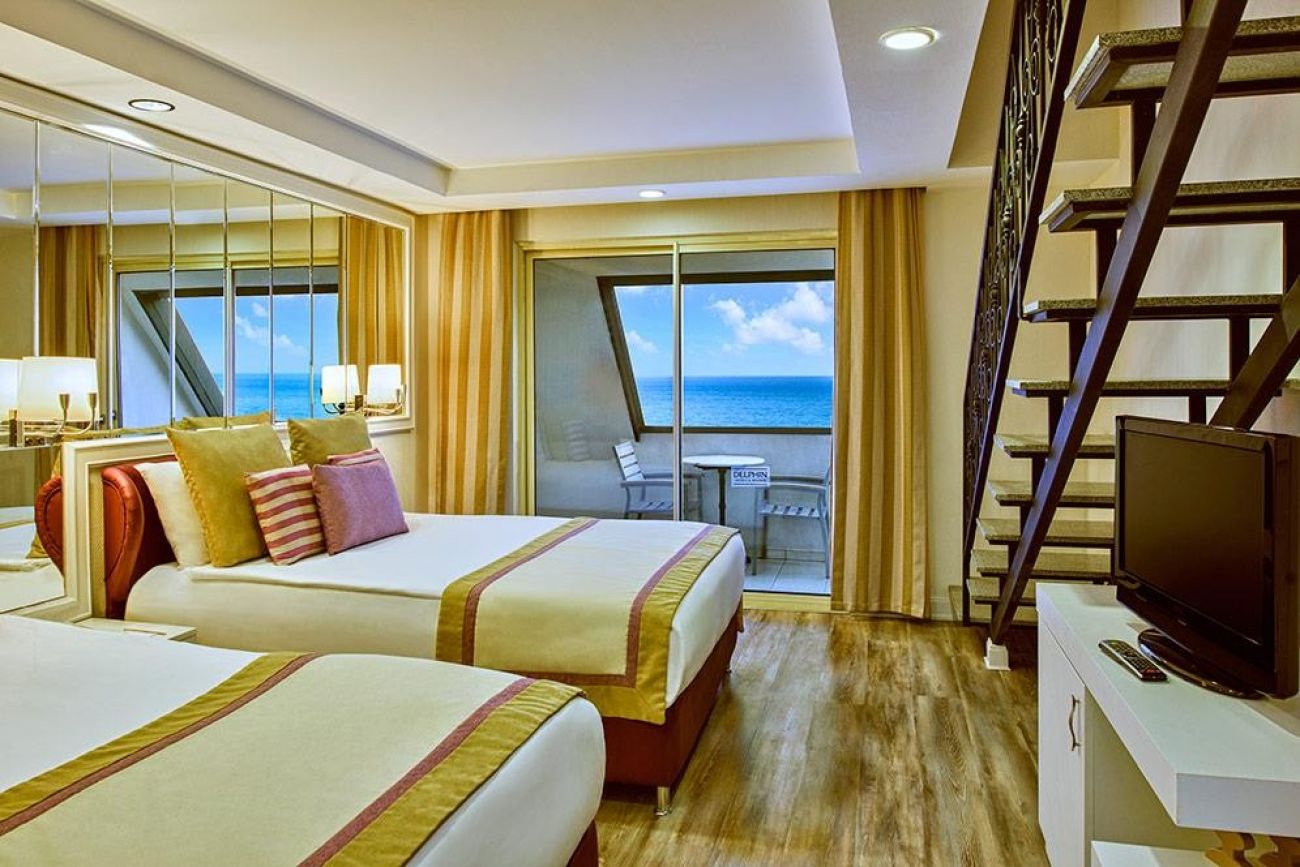 Стая 26 кв.м с балкон и директен морски изглед, с едно двойно и едно единично легло, диван, подходяща за 3+1 или 2+2 души, с баня с душ и тоалетна, климатик, минибар, сейф, LCD телевизор, безплатен Wi-Fi, ежедневно почистване и възможност за бебешка кошара.
