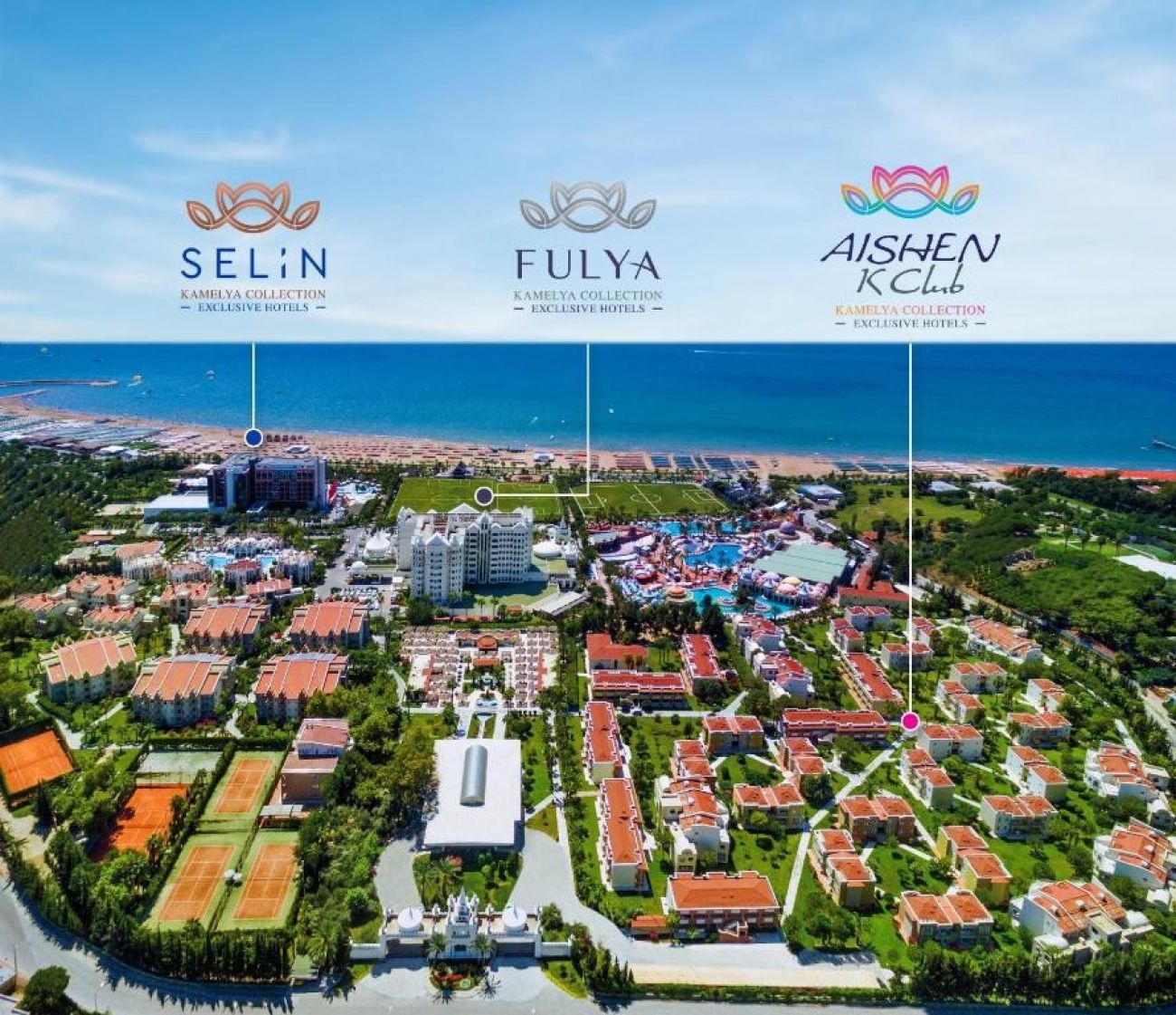 На територията на хотела: Oсновен ресторант, 5 a la carte ресторанта (китайски, рибен, италиански, турски, мексикански – с предварителна резервация, срещу заплащане), 7 бара, 3 открити басейна, закрит басейн, релакс басейн, аквапарк (6 водни пързалки), кино (в хотел Fulya), лекарски кабинет, СПА център (в хотел Fulya; платено), фризьорски салон, търговска алея, пералня (платено), химическо чистене (платено), 3 футболни игрища (65х100, 48х90, 70х95)