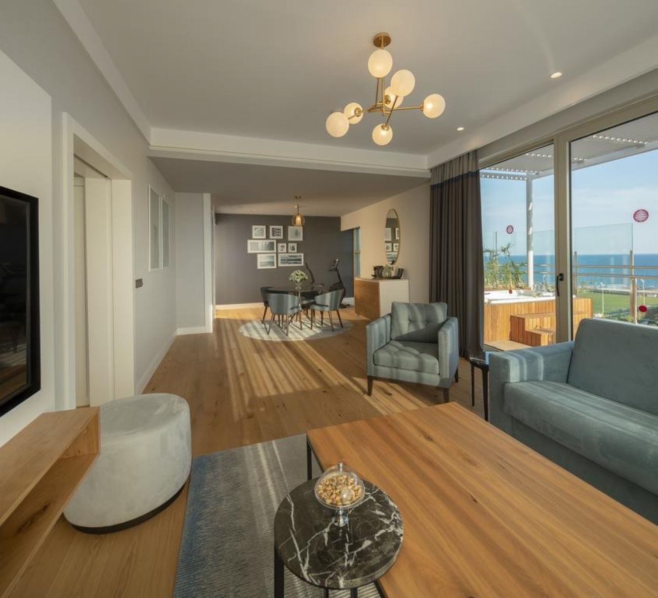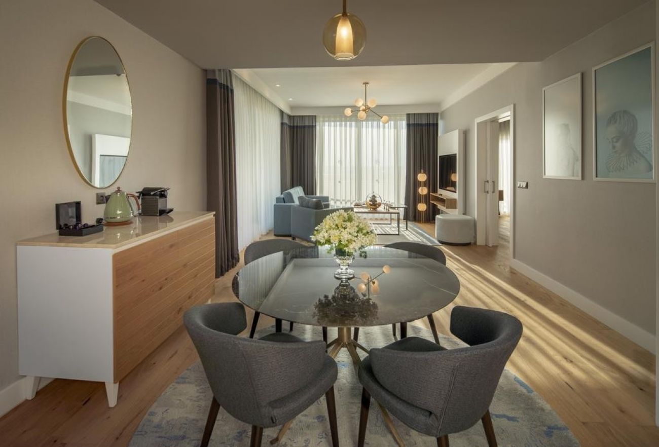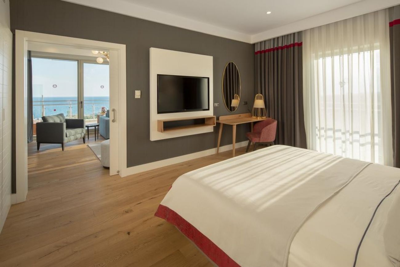 Стаи Main building: 74 Deluxe Room with Partial Sea View (частичен изглед море - 38м2), 84 Deluxe Room with Partial Sea and Pool View (частичен изглед море и басейн - 38м2), 36 Deluxe Room with Sea View (изглед море - 48 м2), 16 Corner Suite with Jacuzzi & Sea View (спалня, баня, тераса с джакузи - 48 м2), 4 Designer Suite (спалня и хол разделени с врата, баня, кафе Nespresso, тераса с джакузи - 68 м2), 3 Grand Designer Suite (изглед море, спалня и хол разделени с плъзгаща врата, 2 бани, кафе Nespresso, тераса с джакузи - 106 м2), 3 Designer Suite 360 (спалня с кръгло легло, баня, кафе Nespresso, тераса с джакузи - 55 м2).