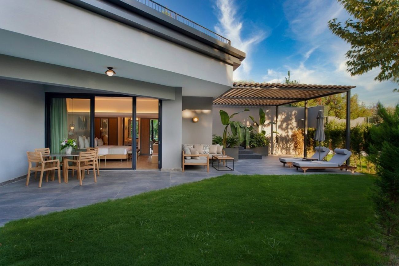 Стаи Anex building: Deluxe room with private garden (частна градина – 38 м2 с два шезлонга, чадър и кът за сядане, изглед градина – 80 м2).