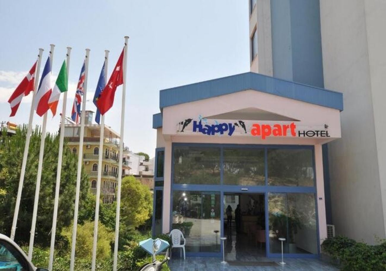 Happy Apart Hotel е семеен комплекс, реновиран през 2015 г. Предлага настаняване с възможност за самостоятелно готвене и пране. Комплексът е разположен около голям басейн със снек-бар край него. Намира се на тихо място в района на Дамския плаж, само на 250 м от самия плаж. Модерните апартаменти имат голяма дневна зона с отворен план и кухненски бокс и отделна спалня с 2 отделни легла. Облицованите с керамични плочки бани са оборудвани с душ, мивка и тоалетна. Хотелът разполага с тераса за слънчеви бани с LED осветление. За комфорта на гостите са предоставени шезлонги и градински възглавници. Съоръженията на комплекса включват плувен басейн с детски сектор, обширни градини и минимаркет.
