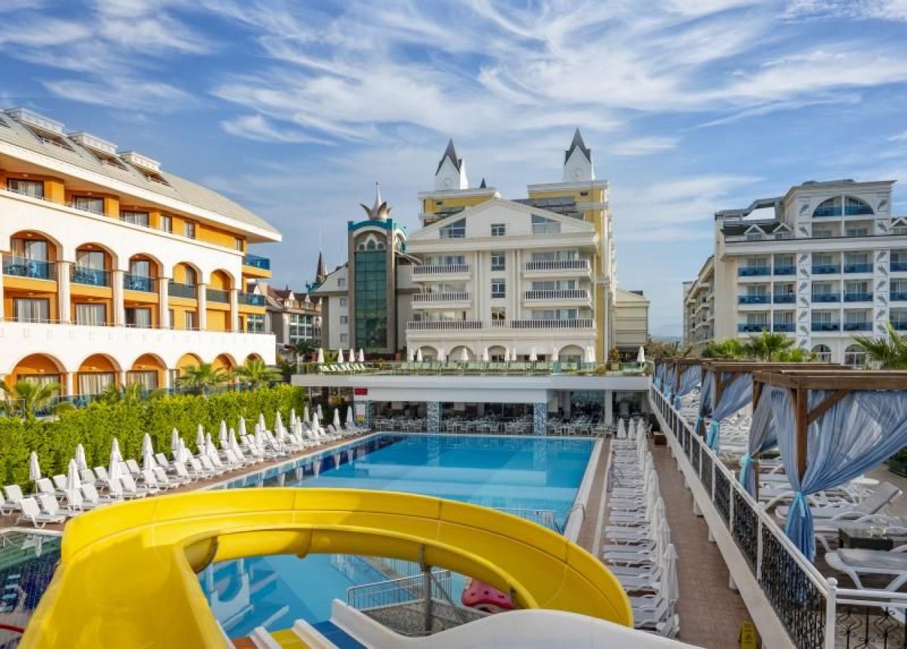 Съседни хотели: Dream World "Аква". Състои се от една 5-етажна сграда.