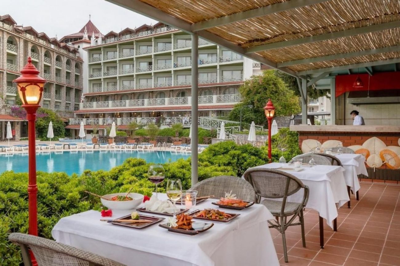 Основен ресторант, 2 а-ла-карт ресторанта (срещу заплащане), 3 бара, 1 открит басейн (600м²) , амфитеатър, магазини, СПА център, 5 конферентни зали, паркинг. Безплатни услуги: Сауна, турска баня, джакузи, парна баня, фитнес, аеробика, зумба, пилатес, дартс, тай-чи, бочиа, плажен волейбол, тенис корт, тенис на маса, анимация, музика на живо, караоке, тематични партита, WI-FI интернет (на лоби). Платени услуги: СПА център, масаж, пилинг, фризьор, магазини, химическо чистене, оборудване за тенис корт, осветление на тенис корта, безмоторни и моторни водни спортове. Плаж: Собствен, пясъчен удостоен със сертификат "Син флаг" .Чадъри и шезлонги на плажа и при басейна – безплатно, плажни кърпи - безплатно.