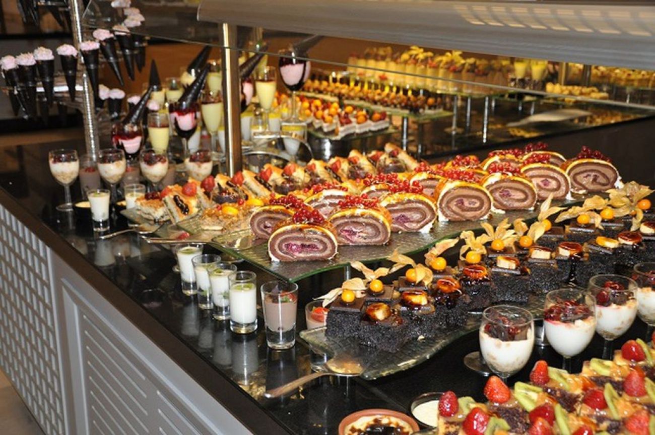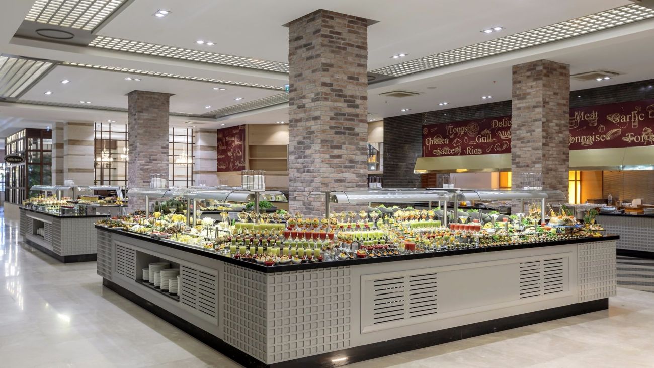 База на изхранване-HiGH CLASS.концепцията на хотела освен 24 богато изхранване, включва и много марков алкохол също безплатно. коняк -2 вида, водка, текила, джин по 3 вида,ром,ликьор по 5 вида,кампари и уиски по 7 вида/. 1 Основен ресторант/предлага се и детска кухня и диетично меню/закрита и открита част,снек ресторант около басейните, 5 алакарт ресторанта-азиатски, турски, италиански, рибен и мексикански. Посещението на всеки един от тях по веднъж –безплатно за седмица, с предварителна резервация.