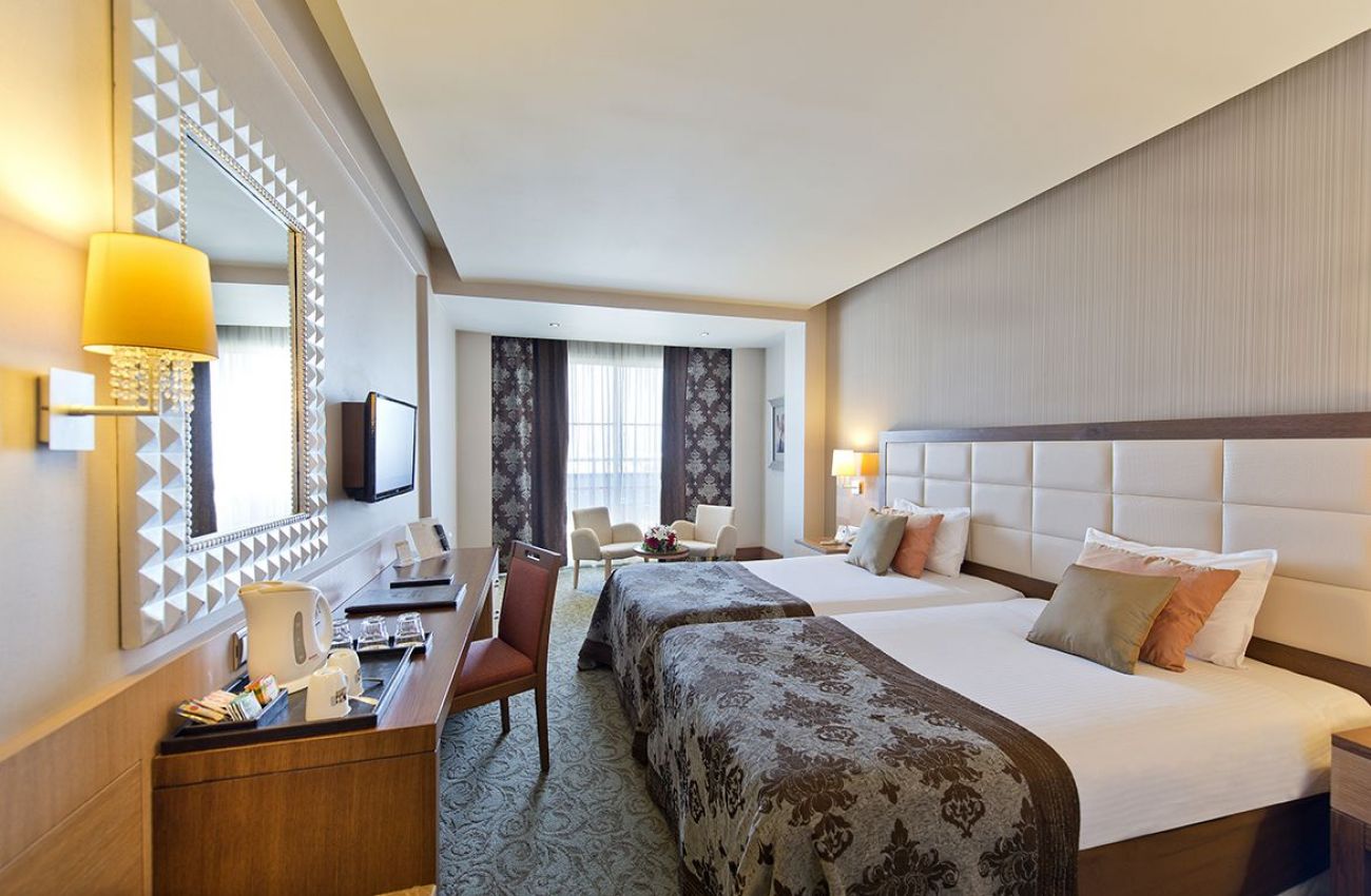 вана, сешоар, индивидуален климатик, телевизор, телефон, мини-бар (безалкохолни напитки и бира се зареждат ежедневно), безплатно, сейф (безплатно), подова настилка - теракот, балкон, ежедневно почистване на стаята, смяна на спалното бельо - 2 пъти седмично