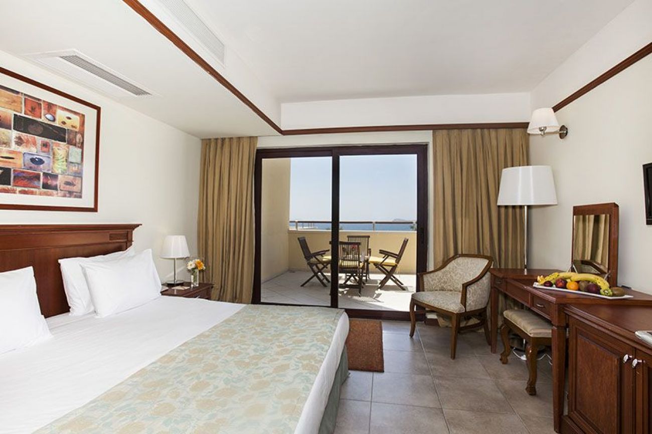 С балкон или тераса (обща площ от 30 кв.м), мини бар, машина за чай и кафе, LCD телевизор със сателитни и музикални програми, телефон с директна линия, сешоар, огледало за гримиране, WC Душ кабина, централен климатик и електронен сейф. Стаите са с изглед към морето или градината.