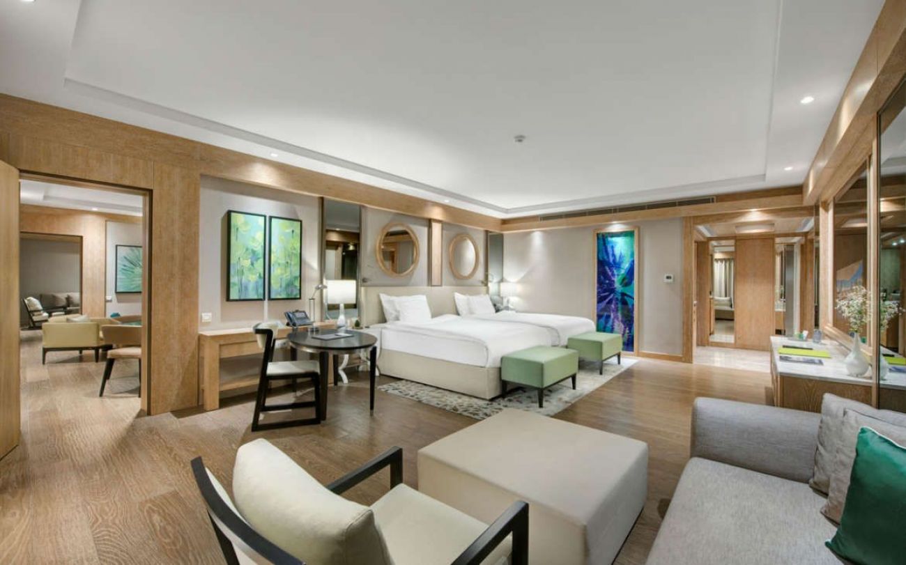 2 тристайни Presidential Suitе room sea view (хол с мека мебел, 2 спални с врата, 2 бани: 1 с джакузи и душ, 1 само с душ, голям балкон, макс. 4+1 чов., 150 м2, VIP-обслужване)