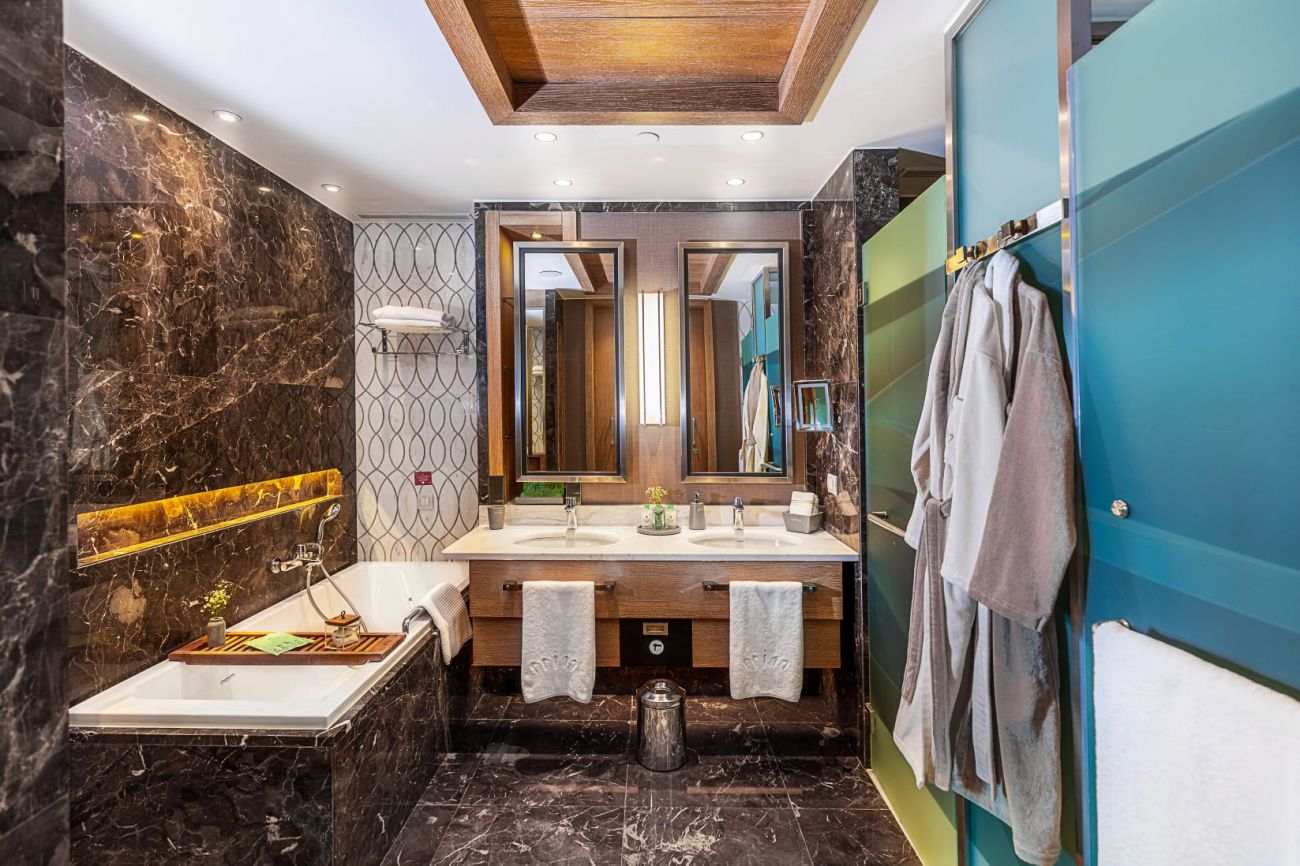 12 двустайни Luxury suite sea view (хол с мека мебел, спалня с врата, 2 бани: 1 с душ и джакузи, 1 само с душ, макс. 4+1 чов., 100 м2)
