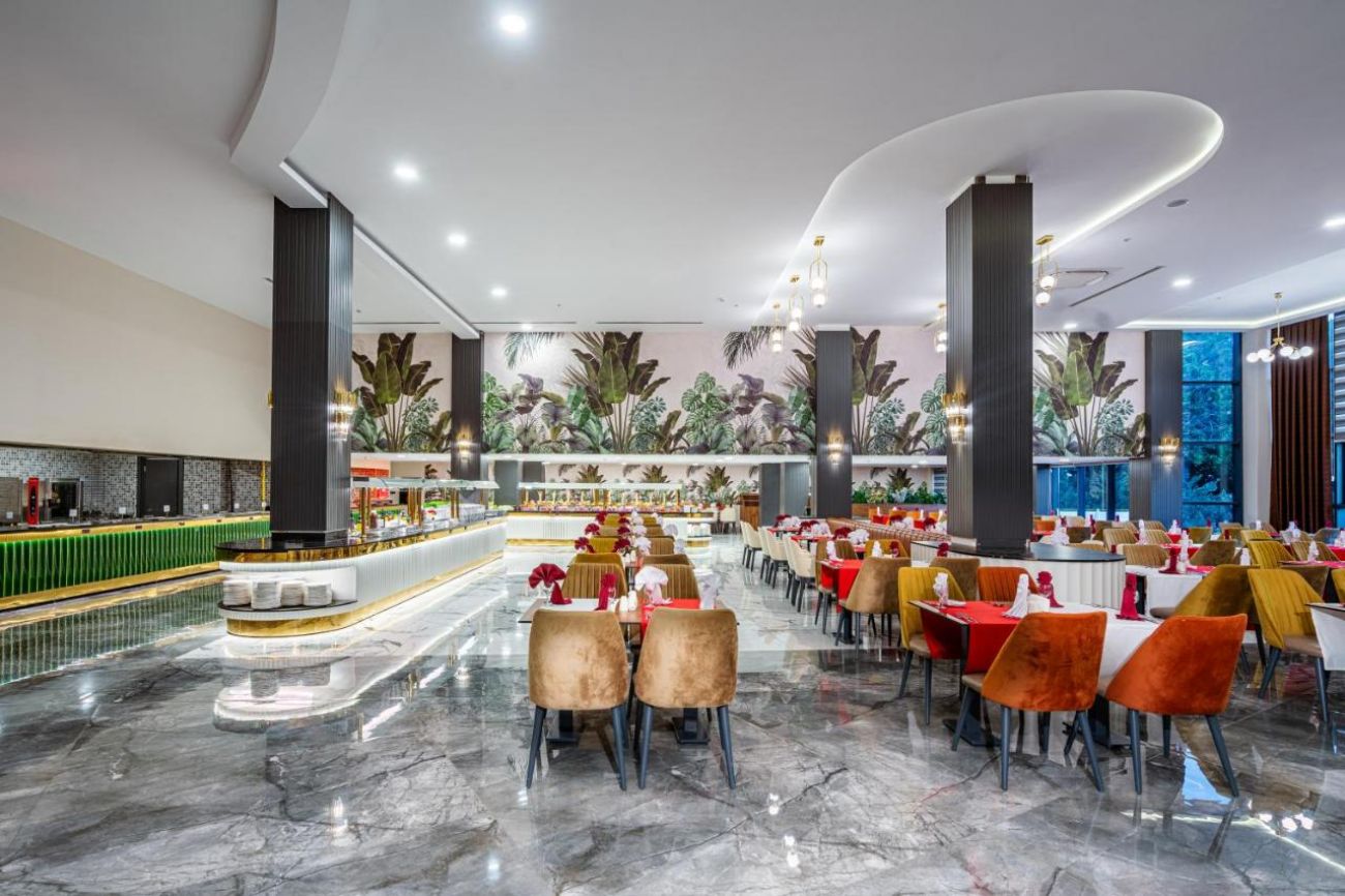 Основен ресторант, а-ла-карт ресторант – интернационален (1 безплатно посещение минимум 7 нощувки), сладкарница, 3 бара, открит и закрит басейн, водни пързалки, СПА център.